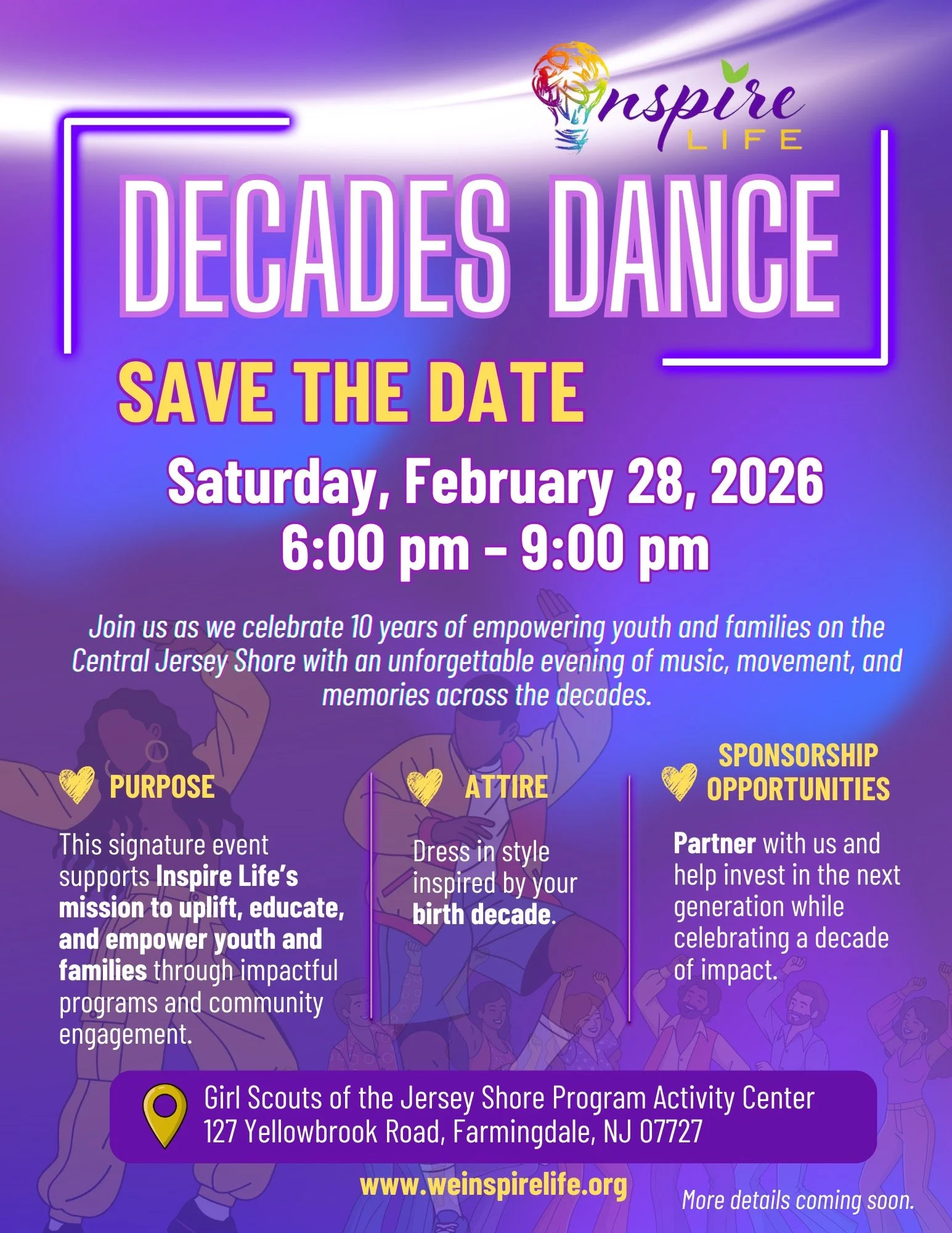Inspire Life is turning 10, and we’re celebrating the only way we know how: with community, music, movement, and joy! Join us for the Decades Dance, a special anniversary celebration honoring a decade of empowering youth and families across the Central Jersey Shore.